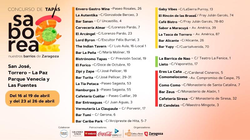 Los propietarios de los negocios interesados pueden inscribirse de manera gratuita a través de la página web que ya está habilitada https://concursodetapaszaragoza.com/inscripciones-saborea-nuestros-barrios.