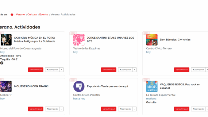 Pero el portal ‘Verano cultural’ incluye también las actividades organizadas por otras entidades públicas y privadas en nuestra ciudad. Así, recoge los conciertos organizados por la red de salas de música Aragón en Vivo durante el verano o las que se celebran en los centros culturales de Ibercaja, entre otras actividades.