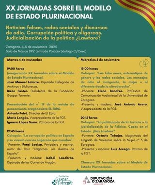 La Diputación de Zaragoza y la Fundación Gaspar Torrente organizan los próximos 4 y 5 de noviembre las XX Jornadas sobre el Modelo de Estado Plurinacional. Las sesiones, bajo el título “Noticias falsas, redes sociales y discursos de odio. Corrupción política y oligarcas. Judicialización de la política ¿Lawfare?”, tendrán lugar a partir de las 19.00 en la Sala de Música de DPZ (entrada por palacio Sástago, c/Coso), con entrada libre hasta completar aforo.